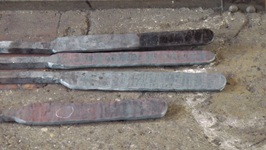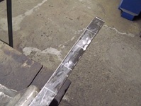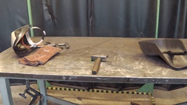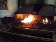Da der Schmiedekurs auf zwei Tage begrenzt ist, gibt es für jeden Teilnehmer vorgefertigte "Pakete" aus zugfestem Flachstahl (ich meine mich zu erinnern, St 50-2) Sie sind jeweils auf einem Quadrat-Stahl aufgeschweißt. Normalerweise wird der Stahl aus mehreren Lagen flächig miteinander verschweisst indem er immer wieder flach ausgeschmiedet und umgeschagen, "gefaltet" wird. Als Hilfe benutzt man zum Feuerschweißen das sauerstoffverdrängende mineralische Pulver "Borax", welches sich bei Hitze verflüssigt.