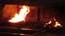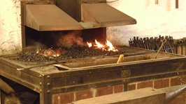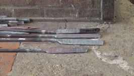 Da der Schmiedekurs auf zwei Tage begrenzt ist, gibt es für jeden Teilnehmer vorgefertigte "Pakete" aus zugfestem Flachstahl (ich meine mich zu erinnern, St 50-2) Sie sind jeweils auf einem Quadrat-Stahl aufgeschweißt. Normalerweise wird der Stahl aus mehreren Lagen flächig miteinander verschweisst indem er immer wieder flach ausgeschmiedet und umgeschagen, "gefaltet" wird. Als Hilfe benutzt man zum Feuerschweißen das sauerstoffverdrängende mineralische Pulver "Borax", welches sich bei Hitze verflüssigt.