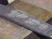 Dies soll die Zunderbildung, die durch den Kontakt des Stahls in der Abkühlungsphase mit unserem Sauerstoff entsteht, vermieden werden. Hier wurden die Seitenflächen der Pakete mit Boraxpulver behandelt. Durch das Verflüssigen des Pulvers und die Kapillarwirkung konnten die Innenflächen der Stähle somit mit dem Borax in Kontakt treten und sich während der Erwärmung in der mechanischen Bearbeitungsphase miteinander verschweißen.