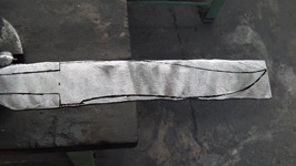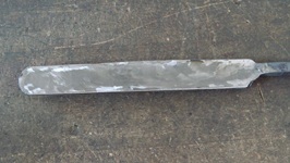 Wir hatten also eine Vorbereitung - gefaltet wurde somit nicht. Eine weitere Hilfe war das Ausschmieden mit dem Federhammer, bei meinem Schwert habe ich den Lufthammer benutzt - beide Maschinen haben unterschiedliche Arbeitsweisen, die auf ihren Antrieb zurückzuführen sind, sowie die damit verbundenen Vor- und Nachteile. Der eine bevorzugt lieber das eine- und der andere das andere Gerät zum Ausschmieden. Das Anbringen der Griffschalen hat ein Kollege vorgenommen, der ausschließlich Pistolengriffe fertigt, daher das eigenwillige Design - mit einer wunderschönen Fassung, wie ich finde!